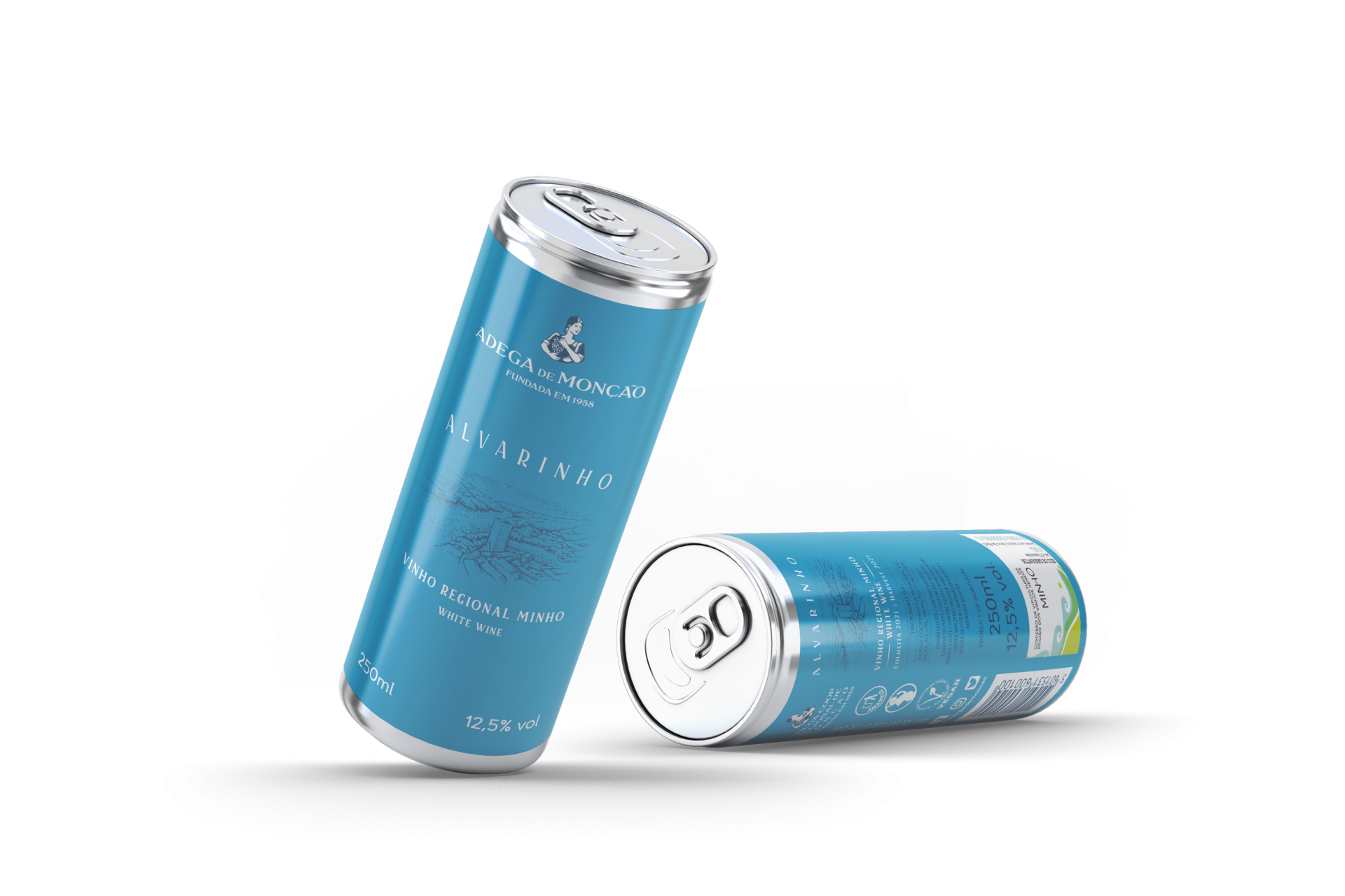 • Latas azuis de bebida Alvarinho com texto branco